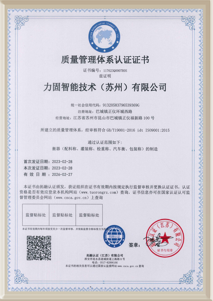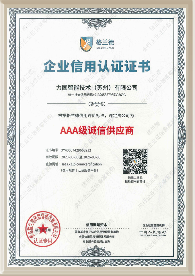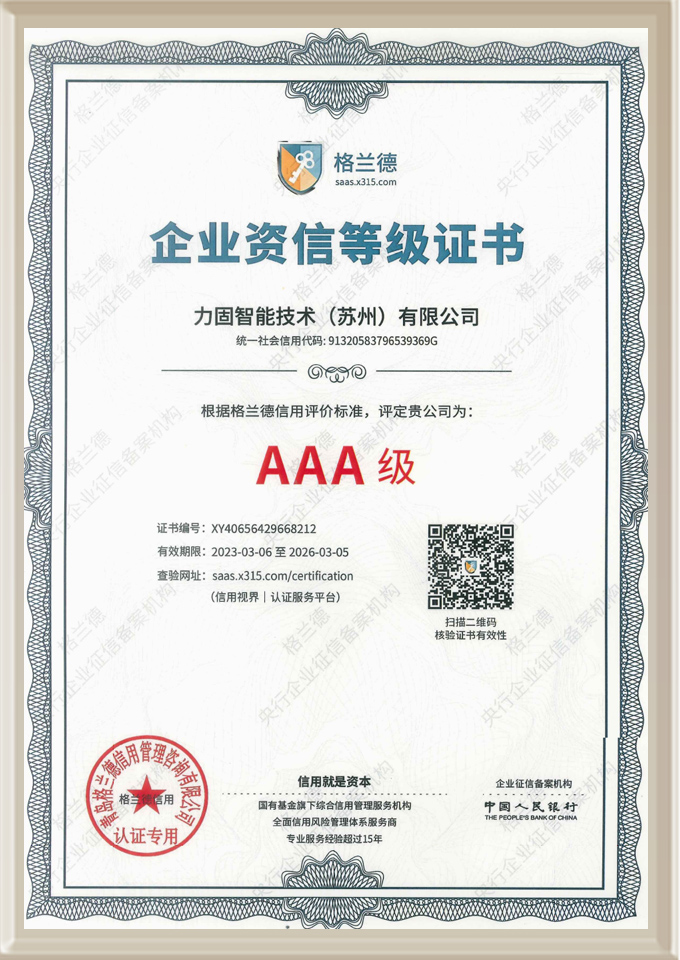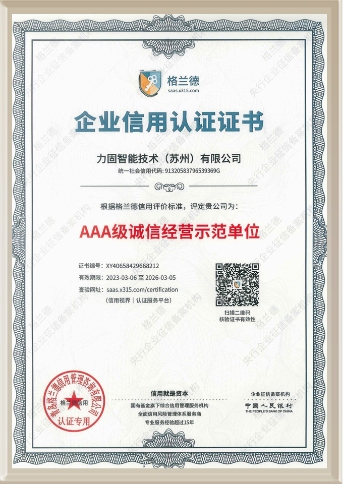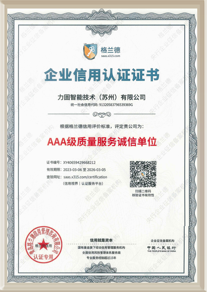 我司現(xiàn)已獲得GB/T19001-2016/ISO 9001:2015質(zhì)量體系認(rèn)證及江蘇省高新技術(shù)企業(yè)認(rèn)證,“力固”品牌聲譽日隆,有口皆碑。